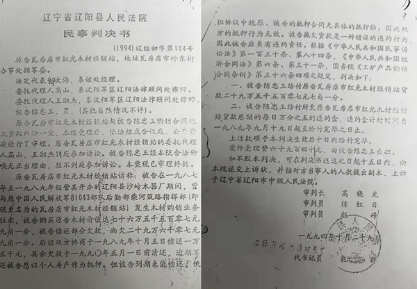 我叫陈忠玉,今年71岁,是辽宁省辽阳市太子河区沙岭镇小沙岭村村民,在1986年至1990年期间,我曾担任辽阳县沙岭镇木器厂(该企业属于镇办集体企业)法人代表。该企业于1990年倒闭,经镇工业办处理善后工作,辽阳县沙岭镇木器厂在经营期间与瓦房店市红光木材经销站发生的双方互欠账没有冲账。1994年,瓦房店市红光木材经销站到辽阳县法院起诉我拖欠购销货款。但是,辽阳县法院(1994辽经初字第104号判决)在得到原告给付10万元好处费的承诺下,故意搞缺席判决(未给我送达过传票和判决书),利用原告提供的伪造的400元收据(在辽经重字第13号判决中第4页下半部,原告已经承认,陈忠玉没有给付过400元还款,400元票据上的陈忠玉名为原告方会计代写,与陈忠玉没有任何关系),把已经逾诉讼时效6年的案子,强加到我个人的头上(企业为镇办集体企业,有证据)。这个400元假还款证据在诉讼不失效和改变整个案件的诉讼主体方面起到了至关重要的作用。最终,辽阳县法院判决由我个人支付原告296007元,双方互欠账冲账后,沙岭镇木器厂欠原告11万,原告实则拿走24万,多拿了13万。原告在给法院信中承诺“余款给法院”,并行贿10万元,法院便在无事实依据的情况下给我加判了日万分之五的违约金26余万,恶意搞缺席判决,剥夺我答辩的权利,掩盖事实真相。